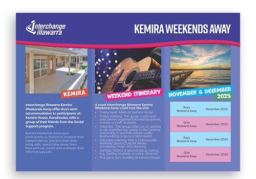 If you would like more information about the Kemira Weekends Away please email socialsupport@interchangeillawarra.org or call our office on 4227 1079.