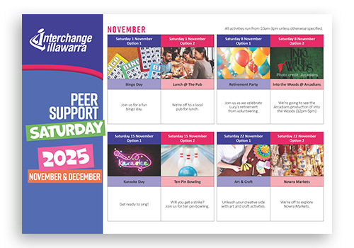 Interchange Illawarra offers several Saturday Social Support Groups that operate on Saturdays at Lake Illawarra and Wollongong.