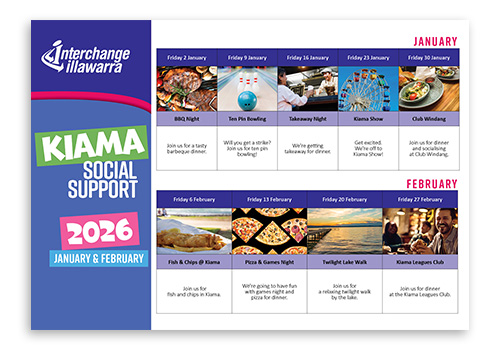 We are super flexible and you can simply book in for the activities that you are interested in. If you would like more information please email socialsupport@interchangeillawarra.org or call our office on 4227 1079.