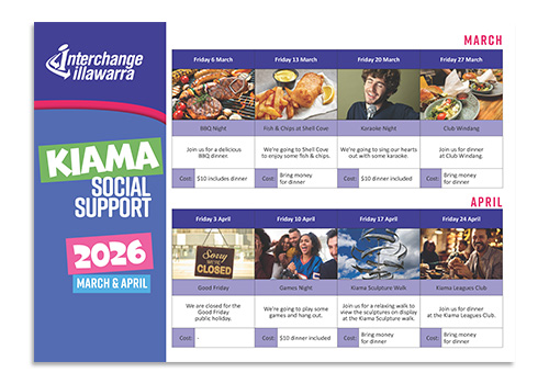 Interchange Illawarra’s Social Support Programs are designed for people with an NDIS plan and low to moderate support needs. If you would like more information about these programs please email info@interchangeillawarra.org or call our office on 4227 1079.