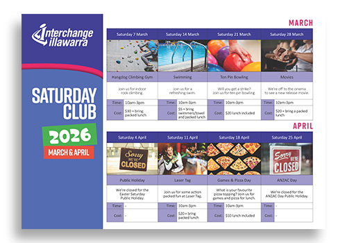 Interchange Illawarra’s Saturday Club is a program for 12-17 year olds featuring activities that run from 10am-3pm on a Saturday.